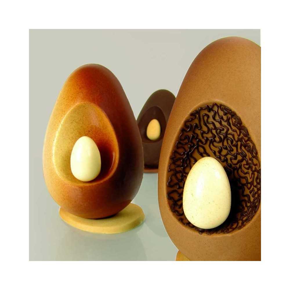 Ένα μοναδικό Kit για την δημιουργία ενός νέου μοντέρνου και μοναδικού σχεδιασμού Πασχαλινού Σοκολατένιου Αυγού που αποτελείται από τρία διαφορετικά σχήματα, το μεγάλο αυγό, το μικρό και την βάση τους!