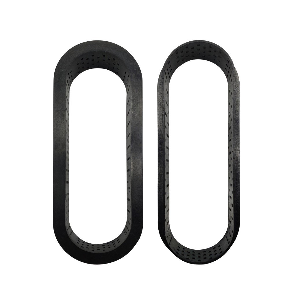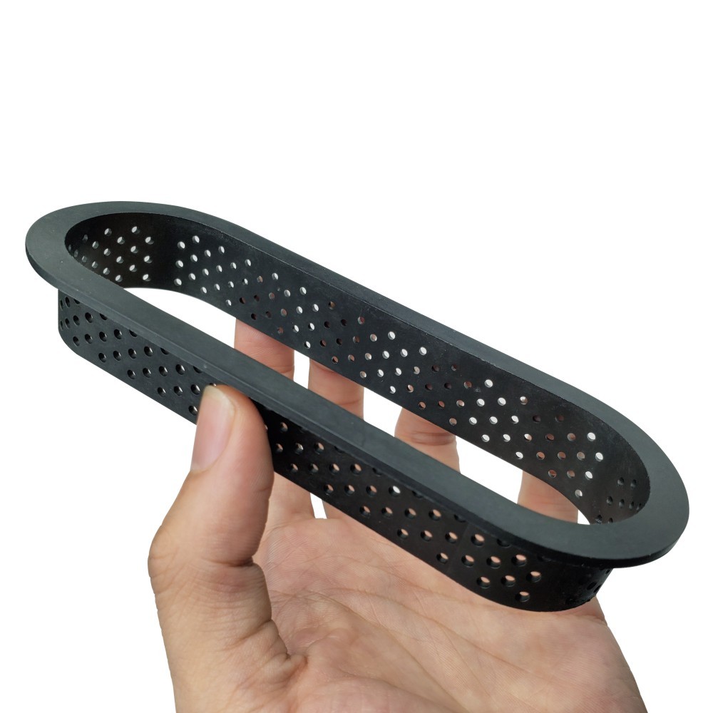 Πλαστικό δαχτυλίδι ψησίματος σε οβάλ σχήμα, με διάτρητες πλευρές για ομοιόμορφο ψήσιμο και τραγανή βάση. Ιδανικό για τάρτες, μπισκότα ή αλμυρές συνθέσεις που απαιτούν κομψή παρουσίαση και επαγγελματικό φινίρισμα. Οι τρύπες στις πλευρές επιτρέπουν την κυκλοφορία του αέρα, εξασφαλίζοντας σταθερό αποτέλεσμα χωρίς υγρασία ή παραμορφώσεις.