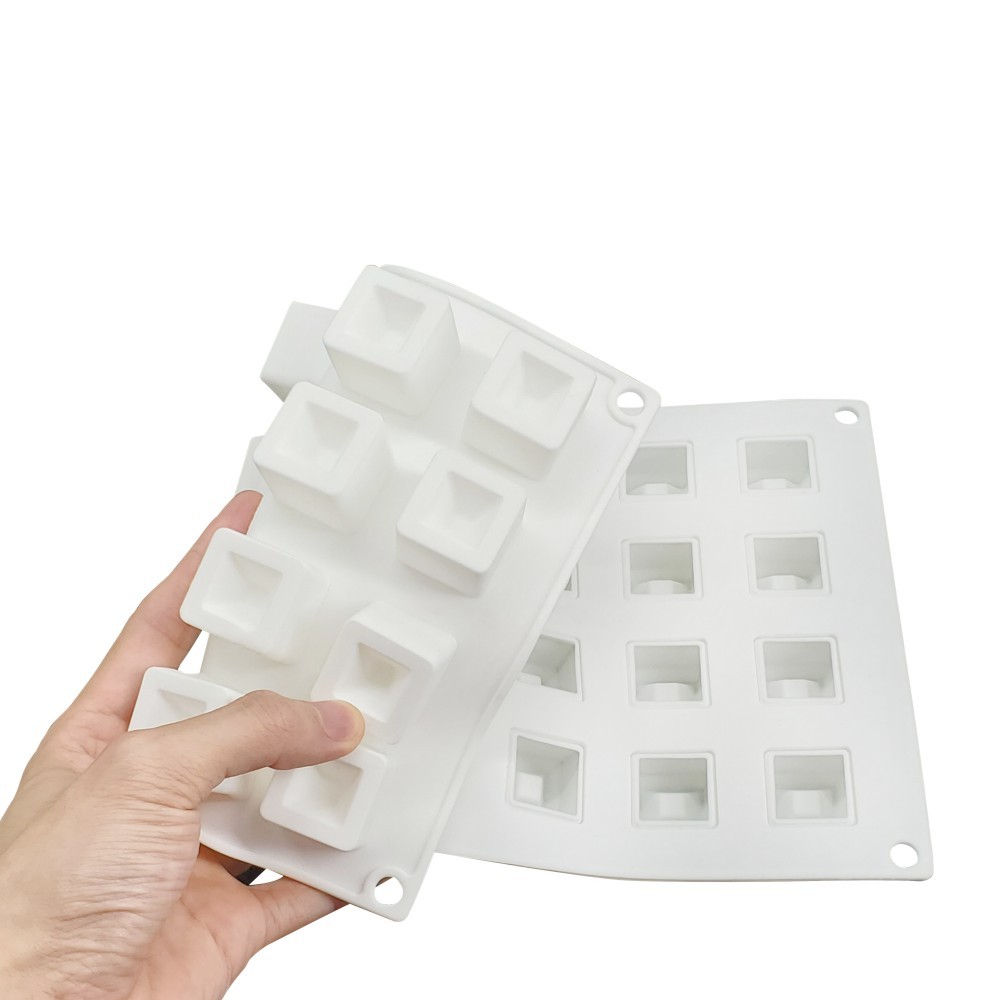 Silicone mold that creates small square monoportions from cake, chocolate, mousse or ice cream, with a subtle top indent—perfect for filling with colorful gel. Ideal for tasting menus, fine dining plating, and pastry showcases that highlight geometry and color contrast. The shape offers clarity, symmetry, and the ability to build layered or visually striking desserts.