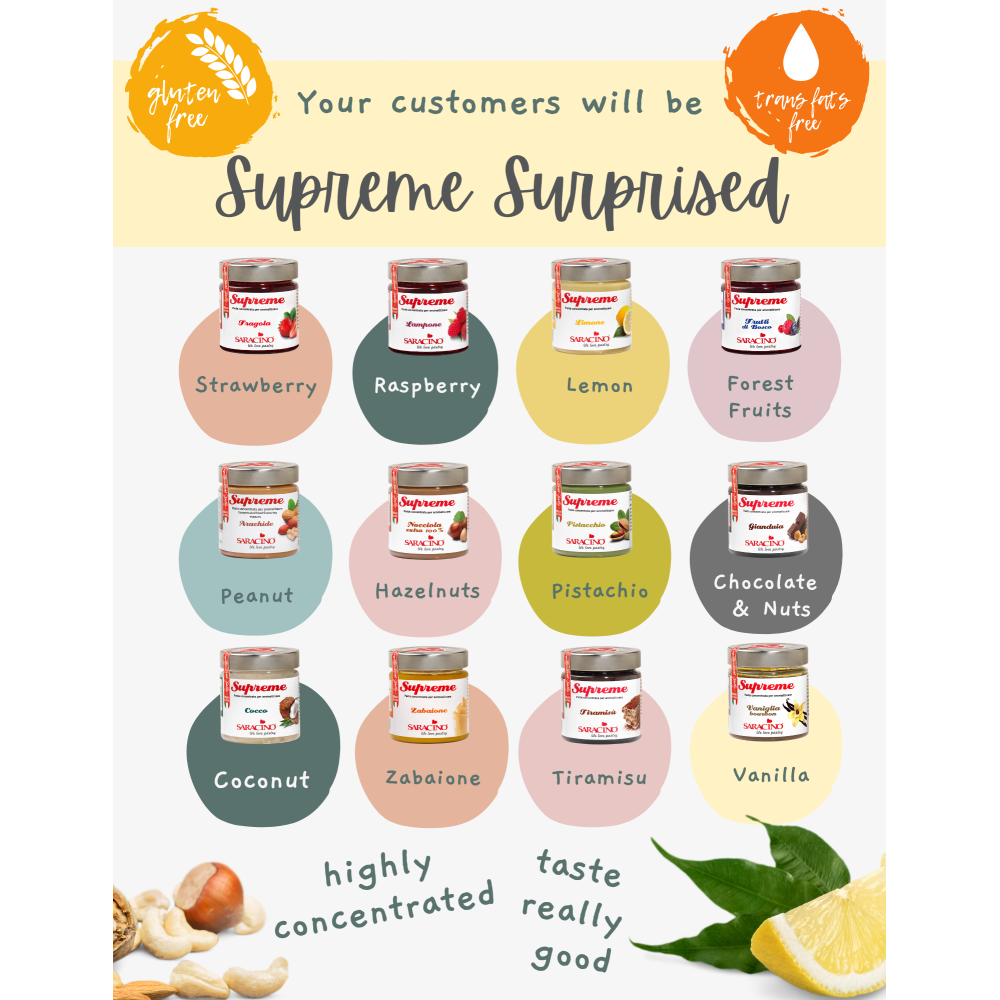Top quality Le Supreme aromatic pastes ideal for flavoring your creams and fillings, for creating ice cream flavors and for every dessert and preparation to which you want to give a truly pure, unique taste of a natural, quality product, with the guarantee of the Saracino name.