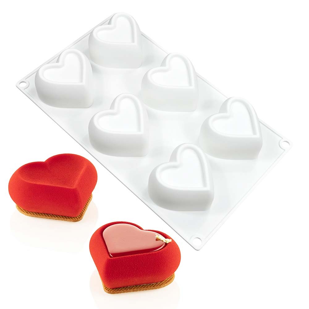 Perfect for creating romantic single-serve desserts, this heart-shaped silicone mold with a recessed top allows stunning presentations with fillings, glazes, or layered textures. Suitable for mousse, semifreddo, doughs, chocolate, or sugarcraft.