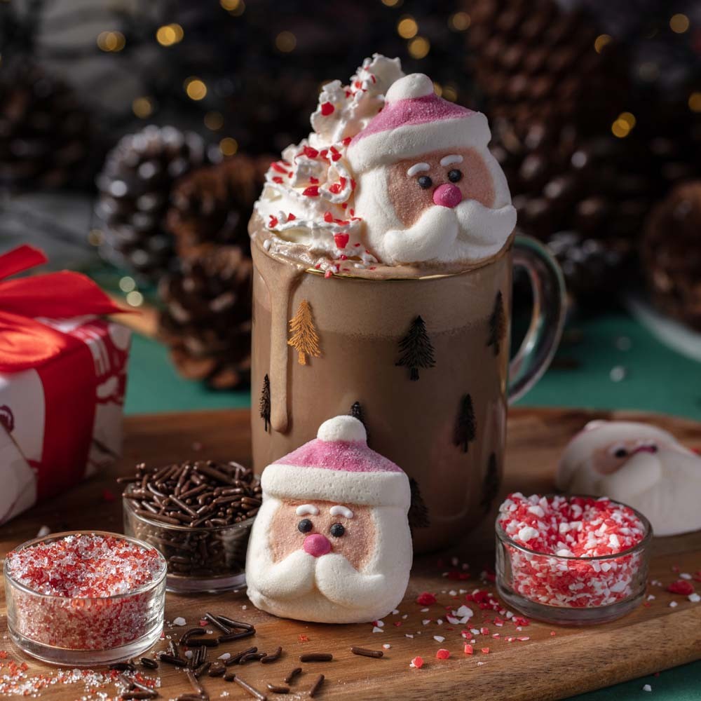 6 x puffy Santa mallows and 3 sprinkle sachets(Chocolate jimmies, red & white edible glitter sugar sprinkles and crushed peppermint candy cane)