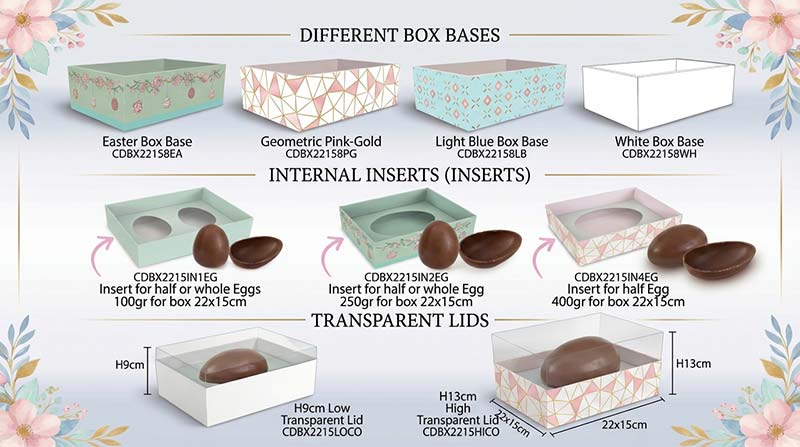 - A. The base which has dimensions L22xW15xH8cm. We have 4 different base designs available. The Easter Base, The Pink Triangles Base, the Ciel Box and the White Box